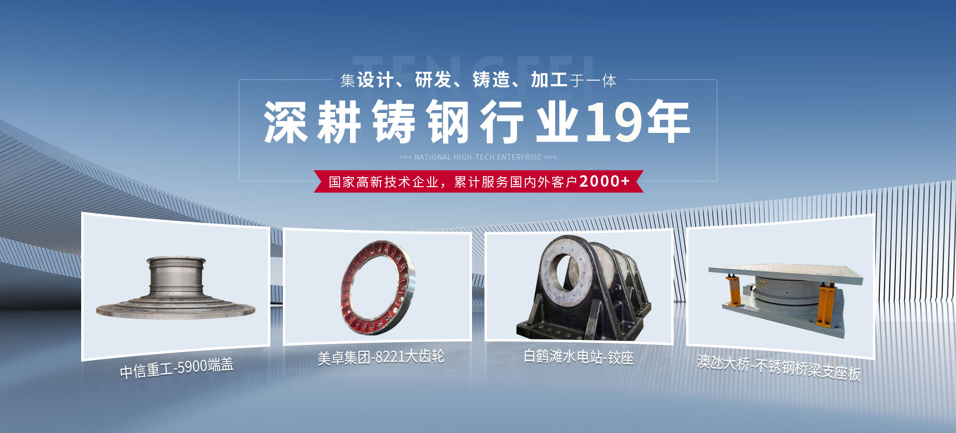 騰飛鑄鋼成立于2006年,位于全國鑄造基地河南省新鄉市,擁有員工300余人,是一家從事150噸以下碳鋼、低合金鋼、不銹鋼鑄鋼件研發、制造、服務為一體的國家高新技術企業。  公司通過了ISO9001國際質量管理體系認證,擁有2項發明專 利,2項河南省科技成果、25項實用新型技術,通過了“環保績效評級B級企業”驗收,先后榮獲“河南省鑄造行業綠色發展企業”、 “河南省科技型中小企業”、“河南省專精特新中小企業”等榮譽稱號?! 」緭碛?臺25噸電爐,4臺大型天燃氣熱處理爐、10米回旋自動拋丸機一臺, φ8m數控立車、φ10m數控滾齒機等各類高精裝備100余臺套,年產能3萬余噸,能為客戶提供從產品設計、木模加工、大型鑄造、大型加工一站式服務,產品廣泛應用于建材、冶金、鍛壓、冶金、水工、路橋、化工等多個重型行業。  長期服務于中信重工、中船重工、美卓、上海中交、萊歇、寶武、濟南重工等全球知名企業,在行業內擁有較高的市場知名度和美譽度。